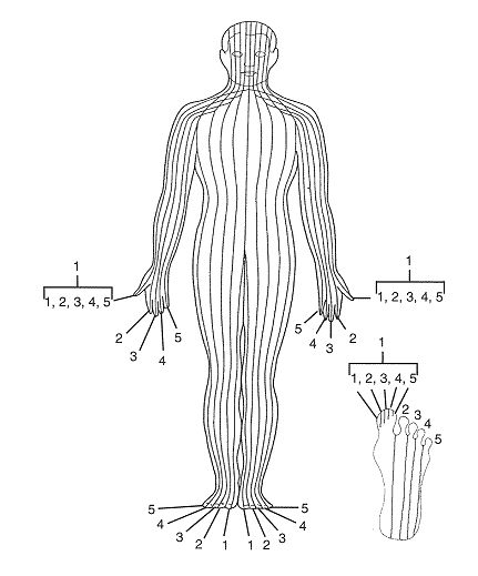 As you can see in the illustration, the body is divided into ten longitudinal zones, which provide a simple numbering sequence. Each toe falls into one zone, and there are five zones in each foot, with the big toe as zone one, through to the little toe, which is zone five; the fingers link up to the zones in the same way.